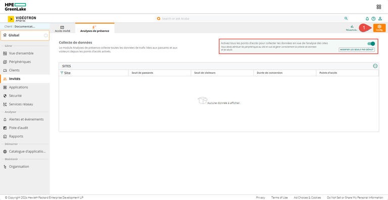 Une fois l’activation des points d’accès effectuée, vous pourrez commencer à collecter des données en vue de procéder à l’analyse des sites. L’Analyse de présence affiche des données pour tous les sites ou par site.