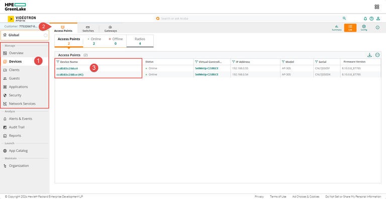 2- In the Manage section on the left, select Devices. Once on the page, make sure you are in the Access Points tab. The page shows your access points in List view. Select the access point you want to get information about by clicking on its name in the Device Name column.